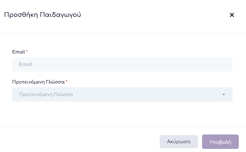 Στη συνέχεια επιλέγει το πεδίο επάνω δεξιά Προσθήκη Παιδαγωγού, συμπληρώνει το email του Παιδαγωγού την προτεινόμενη γλώσσα και τέλος Υποβολή.