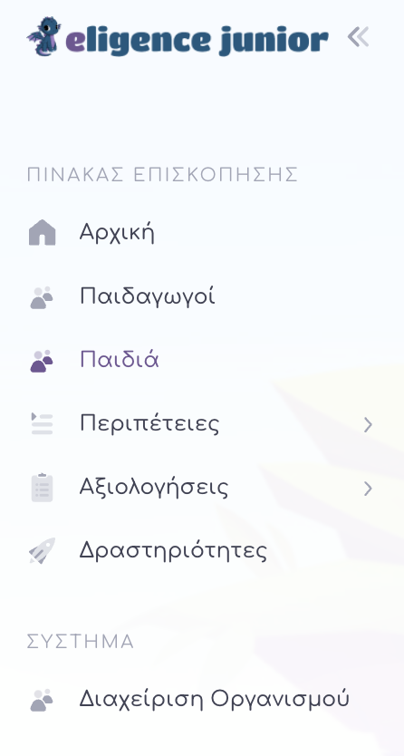 Ο διαχειριστής ενός οργανισμού με την είσοδό του στην πλατφόρμα, επιλέγει από το βασικό μενού αριστερά το πεδίο Παιδιά.