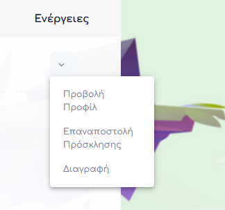 Σε περίπτωση που δεν ενεργοποιηθεί ο λογαριασμός εντός 14 ημερών και πάλι από την κολώνα Ενέργειες ο οργανισμός έχει την επιλογή Επαναποστολής της Πρόσκλησης ή και Διαγραφής.