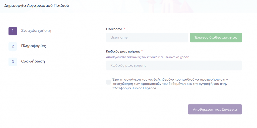 Συμπληρώνετε το username που επιθυμείτε και από το πεδίο Έλεγχος διαθεσιμότητας μπορείτε να επιβεβαιώσετε ότι είναι μοναδικό ως username. Ορίζετε έναν Κωδικό μιας χρήσης και επιβεβαιώνετε ότι έχετε τη συναίνεση του γονέα/κηδεμόνα του παιδιού. Σε περίπτωση που δεν έχετε τη συναίνεση δεν είναι εφικτή η εγγραφή του με αυτόν τον τρόπο. H προσθήκη θα πρέπει να πραγματοποιηθεί μέσω πρόσκλησης.