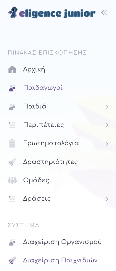 Ο διαχειριστής ενός οργανισμού μπορεί να προσκαλέσει για να προσθέσει έναν Παιδαγωγό σε έναν οργανισμό, επιλέγοντας από το βασικό μενού αριστερά το πεδίο Παιδαγωγοί.