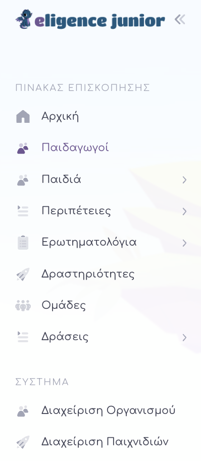 Η ανάθεση ενός ή περισσότερων Παιδαγωγών σε ένα παιδί ή ενός Παιδιού σε έναν Παιδαγωγό μπορεί να πραγματοποιηθεί επιλέγοντας στο μενού αριστερά Παιδαγωγοί ή Παιδιά.