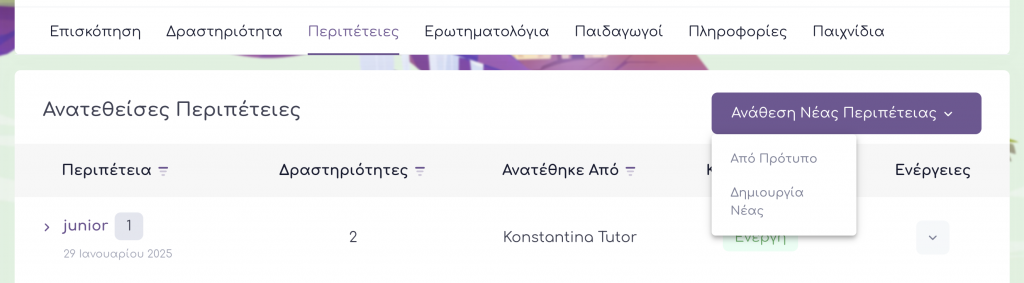 Στη συνέχεια επιλέγετε τη γραμμή με το παιδί που σας ενδιαφέρει, κλικάρετε στο όνομά του και στο μενού που εμφανίζεται επιλέγετε το πεδίο Περιπέτειες και μετά το πεδίο Ανάθεση Νέας Περιπέτειας.