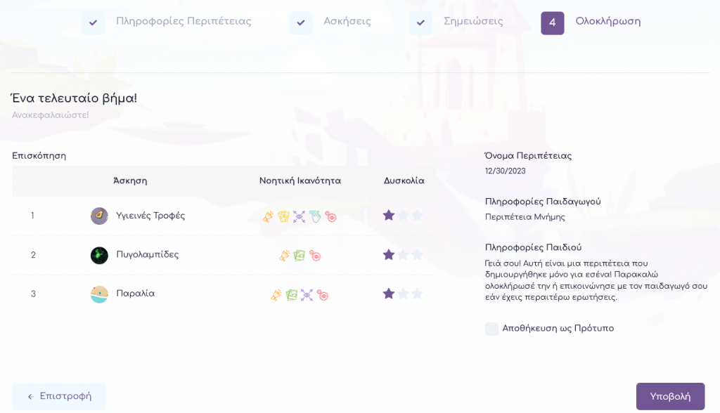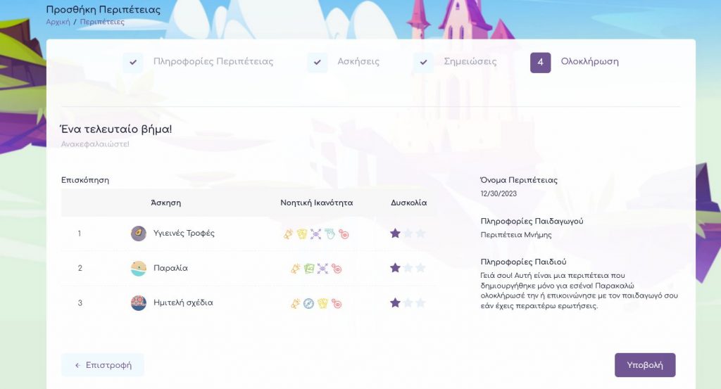 4. Ολοκλήρωση. Σε αυτή την καρτέλα έχετε ολοκληρωμένη εικόνα της Περιπέτειας ως προς τις ασκήσεις που έχετε επιλέξει, τη σειρά εμφάνισης, το επίπεδο δυσκολίας ανά άσκηση και τις απαραίτητες σημειώσεις. Κλικάρετε Υποβολή και η Περιπέτεια είναι έτοιμη.