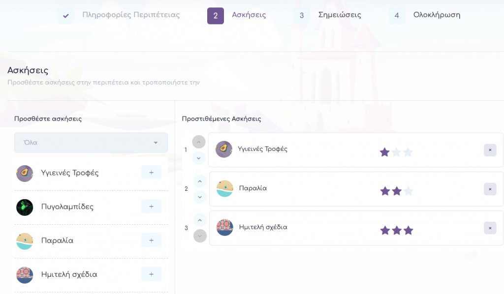 2. Ασκήσεις. Επιλέγετε τις ασκήσεις που θέλετε να συμπεριλάβετε στη Περιπέτεια, κλικάροντας στο πεδίο με τον σταυρό δεξιά από το όνομα της άσκησης. Κλικάροντας στις ασκήσεις που επιλέξατε, δημιουργείται δεξιά η λίστα των επιλεγμένων ασκήσεων. Σε αυτή τη λίστα μπορείτε να επιλέξετε τη σειρά που επιθυμείτε, μετακινώντας το πεδίο της άσκησης στη δεξιά λίστα απλά με drag and drop, όπως και το επίπεδο δυσκολίας για κάθε μία από τις ασκήσεις ξεχωριστά, κλικάροντας απλά το αντίστοιχο αστεράκι δεξιά από το όνομα της άσκησης.