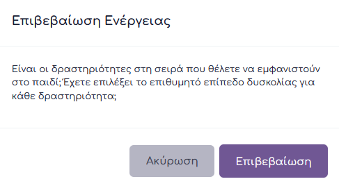 Ολοκληρώνοτας τη σειρά των ασκήσεων, επιλέγετε το πεδίο Συνέχεια στο κάτω μέρος της σελίδας, δεξιά και Επιβεβαίωση ή Ακύρωση σε περίπτωση που θέλετε να πραγματοποιήσετε μία αλλαγή.