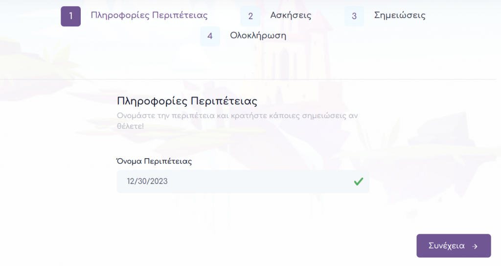 1. Πληροφορίες Περιπέτειας: Συμπληρώνετε το όνομα της Περιπέτειας που θα δημιουργήσετε. Ο τίτλος θα σας βοηθήσει είτε για μελλοντική χρήση και σε άλλο παιδί, είτε ως σημείο αναφοράς για το λόγο δημιουργίας του πχ Περιπέτεια για ενίσχυση της Μνήμης.