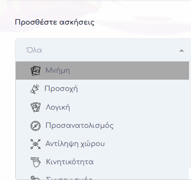 Για τη δημιουργίας της λίστας, κλικάροντας στο βελάκι αριστερά, κάτω από τον τίτλο Προσθέστε ασκήσεις μπορείτε να δείτε τις ασκήσεις, είτε όλες, είτε ανά την γνωστική δεξιότητα που εξασκούν.