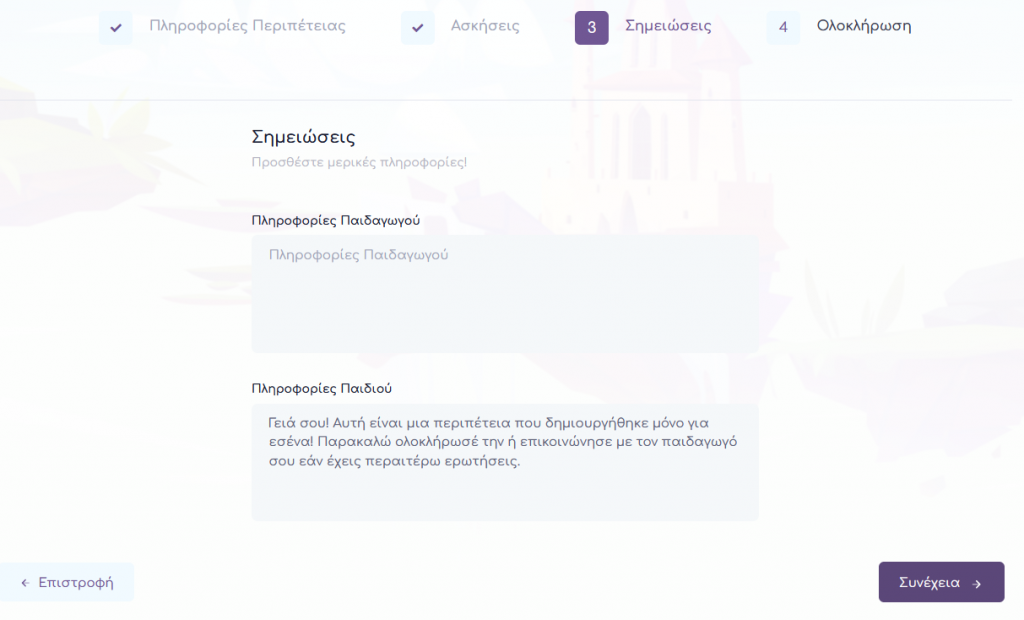 3. Σημειώσεις. Στο πρώτο πεδίο Πληροφορίες Παιδαγωγού μπορείτε να συμπληρώσετε σημειώσεις που εμφανίζονται μόνο στον Παιδαγωγό, ενώ στο πεδίο Πληροφορίες Παιδιού μπορείτε να συμπληρώσετε ένα μήνυμα που επιθυμείτε να είναι ορατό από το παιδί.