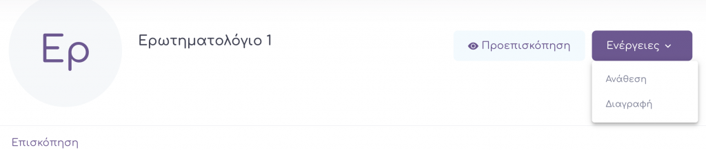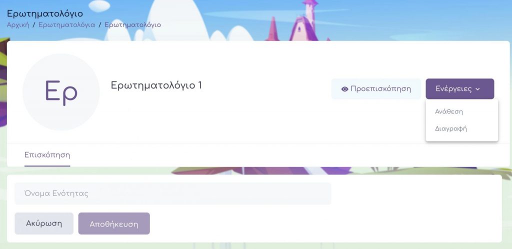 Μετά την συμπλήρωση όλων των ερωτήσεων και των ενοτήτων που επιθυμείτε, μπορείτε από το μενού επάνω δεξιά να επιλέξετε Προεπισκόπηση και να δείτε το Ερωτηματολόγιο όπως θα εμφανιστεί στο παιδί ή να επιλέξετε Ενέργειες οπότε να Αναθέσετε ή να Διαγράψετε το συγκεκριμένο ερωτηματολόγιο σε ένα ή περισσότερα παιδιά.