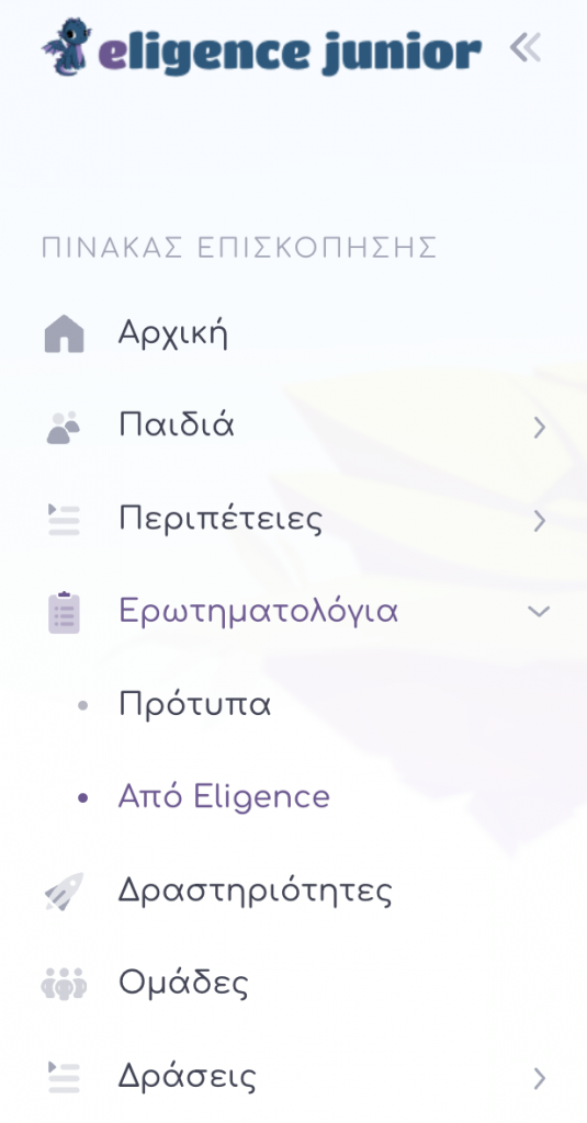 Μέσα από την πλατφόρμα Eligence Junior, ο Παιδαγωγός έχει τη δυνατότητα να δημιουργήσει ένα Πρότυπο Ερωτηματολόγιο, το οποίο είναι εμφανές σε όλους τους Παιδαγωγούς του ίδιου Οργανισμού.