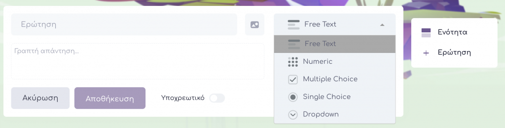 Επιλέγοντας Ερώτηση, έχετε τη δυνατότητα να συμπληρώσετε μία ερώτηση και να επιλέξετε τον τύπο της απάντησης που επιθυμείτε.
