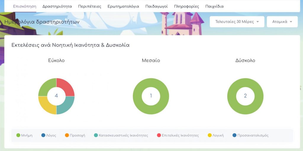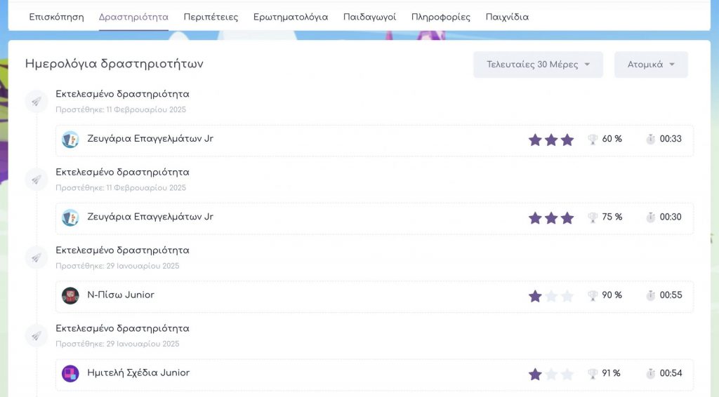 Στην επόμενη επιλογή Δραστηριότητα, μπορείτε να δείτε αναλυτικά σε πραγματικό χρόνο τα παιχνίδια που έχει παίξει, το επίπεδο δυσκολίας, το score, το χρόνο εκτέλεσης όπως και αν ήταν παιχνίδι από μία περιπέτεια ή ελεύθερη επιλογή του παιδιού.