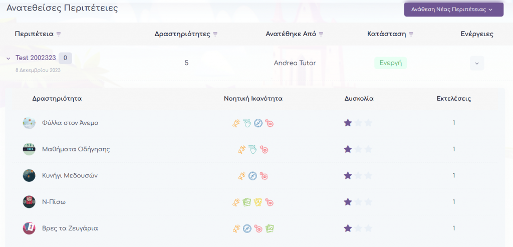 Στην επόμενη επιλογή Περιπέτειες, μπορείτε να δείτε τις περιπέτειες που έχουν ανατεθεί στο παιδί γενικά, είτε από εσάς είτε από άλλο παιδαγωγό, είτε είναι ακόμη ενεργή, ανενεργή ή ανατεθείσα.