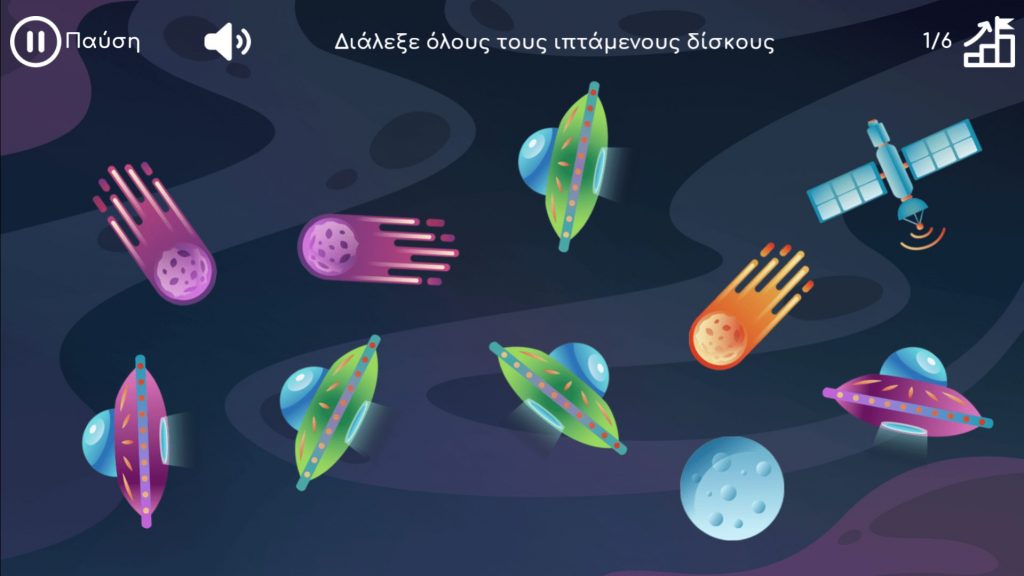 Ένα παιχνίδι γι’ αυτούς που λατρεύουν το διάστημα. Πριν ξεκινήσουμε θα δεις ποιο αντικείμενο πρέπει να διαλέξεις! Τώρα πρέπει να το επιλέξεις ανάμεσα σε άλλα διαστημικά αντικείμενα. Ελπίζω να του έδωσες την απαραίτητη προσοχή, Αστροναύτη! Μια εκπαιδευτική δραστηριότητα που εξασκεί τη μνήμη εργασίας, την οπτική διάκριση και την προσοχή. Μέσα από ένα ευχάριστο και ενδιαφέρον παιχνίδι, διαβαθμισμένης δυσκολίας, τα παιδιά εξασκούν τις λειτουργικές τους δεξιότητες διασκεδάζοντας. Παράλληλα, εξοικειώνουμε τους μικρούς μας φίλους με τη νέα τεχνολογία και τον κόσμο της πληροφορικής.