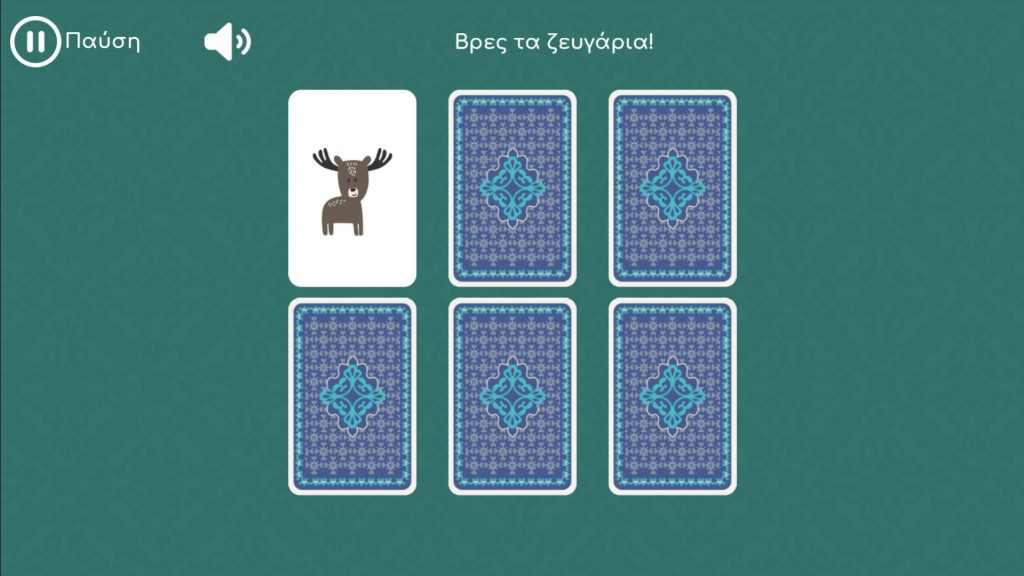 Μια πρόκληση μνήμης μόλις ξεκίνησε! Δες προσεκτικά τις κάρτες που είναι ανοιχτές. Προσπάθησε να θυμηθείς πού βρίσκεται το κάθε αντικείμενο. Όταν νιώσεις ότι τα θυμάσαι καλά, κάνε κλικ και οι κάρτες θα γυρίσουν ανάποδα. Τώρα, προσπάθησε να βρεις και να ανοίξεις τα ζευγάρια καρτών που έχουν τα ίδια σχέδια. Μια εκπαιδευτική δραστηριότητα που εξασκεί τη μνήμη εργασίας και την προσοχή. Τα παιδιά πρέπει να απομνημονεύσουν τη θέση ορισμένων καρτών στην οθόνη. Όταν νιώσουν έτοιμα, πιέζουν το πλήκτρο «έτοιμοι» και οι κάρτες αναποδογυρίζουν. Έπειτα πρέπει να επιλέξουν το σωστό ζεύγος εικόνων. Παράλληλα εξασκούνται στην αντίληψη του χώρου, στον προσανατολισμό και στη λήψη αποφάσεων.
