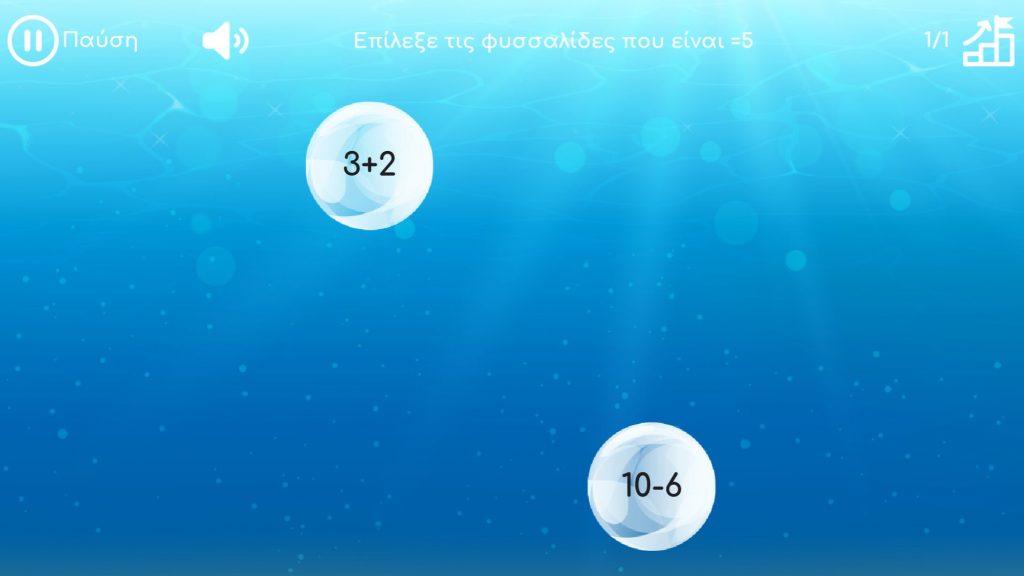 Ετοιμαστείτε για μια μαθηματική περιπέτεια γεμάτη διασκέδαση! Στο παιχνίδι “Φυσαλίδες Αριθμών”, τα παιδιά καλούνται να «σκάσουν» φυσαλίδες. Κάθε φυσαλίδα έχει μια μαθηματική πράξη γραμμένη επάνω της. Για να σκάσουν τη σωστή φυσαλίδα, τα παιδιά πρέπει να υπολογίσουν γρήγορα το αποτέλεσμα της πράξης και να ελέγξουν αν ταιριάζει με το αποτέλεσμα που προβάλλεται στο επάνω μέρος της οθόνης.