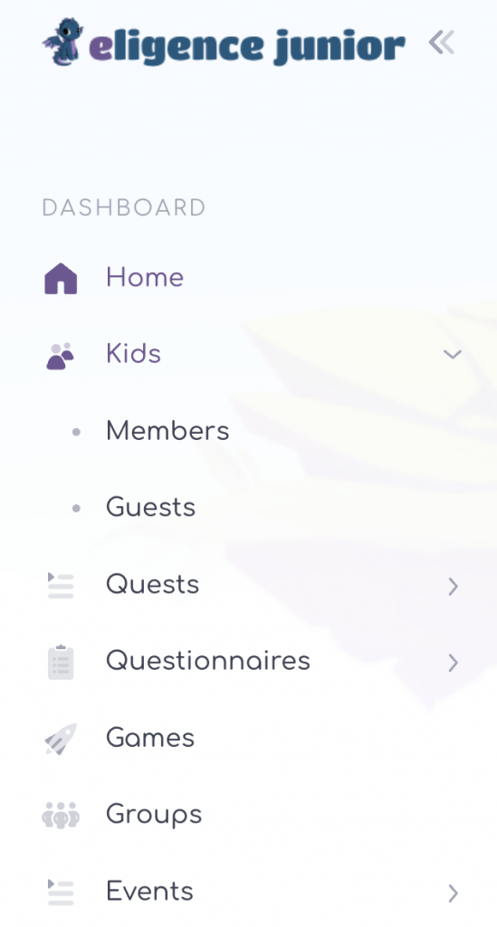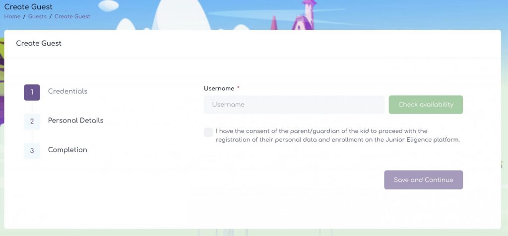 To create a Guest account, the Tutor clicks on the left kids field, then Guests and selects the new field Add Guest at the top right. The basic requirement is that consent has been given by the parent/guardian of a kid to enter their details and register on the Eligence platform.