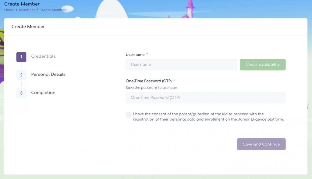 They fill in a username that they wish and from the Availability Check field they can confirm that it is unique as a username. They set a one-time password and confirm that they have the consent of the kid’s parent/guardian. In case they do not have the consent, it is not possible to register the kid in this way. Adding them must be done through the Organization or an Administrator, with an invitation sent via email.