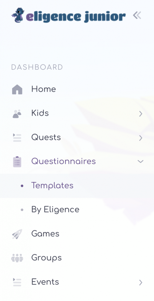 From the list of a questionnaires templates that appears, you can view the content of each questionnaire by clicking on the name of the questionnaire that appears in the first list on the left. These questionnaires have been created by the Eligence Junior platform partners.