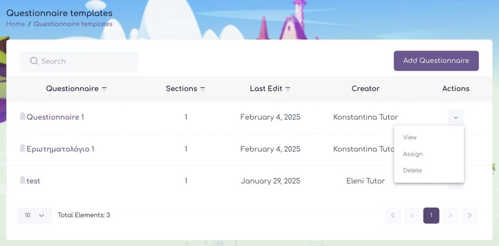 In the list that appears, select the corresponding questionnaire, and click on its name, or click on the arrow under the column titled Actions and select View.