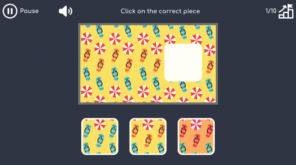Welcome to a game of observation and speed! Can you recognize patterns? Stay focused, and you will definitely succeed!This activity exercises children’s attention and perception, enhancing pre-mathematical skills and spatial awareness. At the same time, it develops visual-motor coordination and spatial orientation. An educational activity full of learning benefits, rich in colors and challenges.